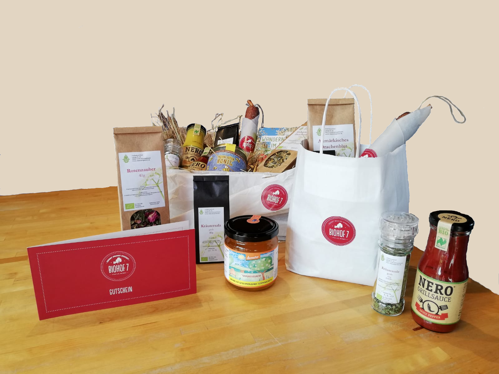 Der Inhalt der Präsente kann individuell nach Wunsch zusammengestellt werden. Zur Auswahl stehen Produkte vom BIOHOF 7 (z.B.