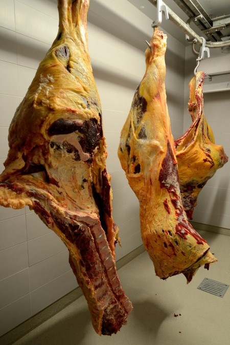 Unser Bio-Rindfleisch reift nach der Schlachtung in Ruhe in der Kühlzelle am Haken und anschließend in der
