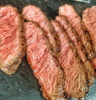 Kommen wir zum Wichtigsten, dem Geschmack! Davor steht jedoch die Zubereitung an. Wie heißt es so schön beim Flat Iron Steak: Zum Kurzbraten geeignet. Für uns heißt das nichts anderes als den Grill anzuwerfen und ordentlich Hitze zu erzeugen. Ob Gas- oder Kohlegrill, Beefer oder Feuerplatte ist dem Steak ziemlich egal. Hier kam die Feuerplatte zum Einsatz, was genauso wie bei einer Pfanne den Vorteil hat, dass eine gleichmäßige Kruste entsteht. Also von beiden Seiten scharf anbraten bis ausreichend Röstaromen vorhanden sind, und anschließend noch ein wenig indirekt ruhen lassen. Weiter als bis zu einer Kerntemperatur von 54 Grad solltet ihr nicht gehen, 52 Grad finde ich ideal! Wie ihr auf den Bildern sehen könnt, handelt es sich um kurzfaseriges Fleisch.